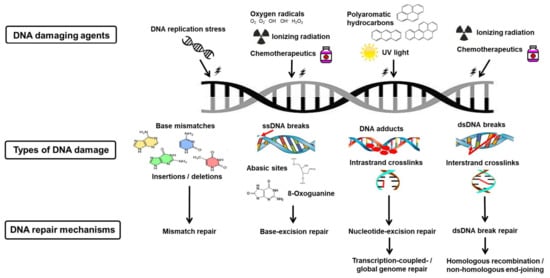 Exogenous DNA damage, originating from external environmental processes, includes ionizing and solar ultraviolet radiation [,]. Ionizing radiation generates a wide variety of DNA lesions [,]. These include single and dsDNA breaks as well as oxidative modifications of nucleobases and deoxyribose moieties [,]. Solar ultraviolet radiation forms cyclobutane pyrimidine dimers which are strongly linked to the aetiology of skin cancer [,,]. Exogenous DNA damage also includes environmental pollutants present in air, water, and food []. Harmful chemicals such as second-hand smoke, pesticides (e.g., organophosphates), and toxic metals (e.g., mercury) are metabolised into highly reactive metabolites that chemically react with nitrogenous bases []. Ultimately, these chemicals lead to deleterious DNA strand breaks and DNA adducts [].