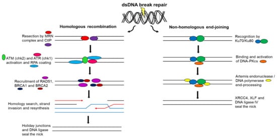 Cell cycle checkpoint prolongation and DDR protein recruitment is highly dependent on the characteristics and complexity of the DNA damage sustained [,]. Therefore, specific DNA repair mechanisms and DNA repair genes are responsible for correcting particular types of DNA lesions [,]. The prominent DNA repair mechanisms include mismatch repair, base-excision repair, nucleotide-excision repair, and dsDNA break repair [,]. dsDNA break repair can be further divided into three subtypes, namely non-homologous end-joining (NHEJ), homologous recombination (HR), and microhomology-mediated end joining (MMEJ) (Figure 3) [,].
