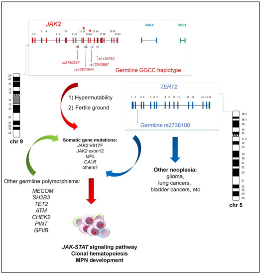 Schematic representation of the JAK2 haplotypeGGCC_46/1 genomic architecture and its possible interplay with the germline TERT rs2736100 in inducing somatic gene mutations, clonal expansion and MPN onset. Red, blu and green arrows refer to the possible induction of somatic gene mutations by the JAK2 haplotypeGGCC_46/1, TERT rs2736100, and other germline polymorphisms, respectively.