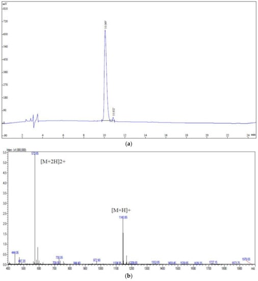 In the present study, in order to identify the peptides in the walnut hydrolysates, UPLC-Q-TOF-MS/MS combined with MASCOT searching was used to analyze the fragment spectra [24]. As shown in Table 1, in total, 6 kinds of proteins containing 33 unique peptides were identified from walnut protein hydrolysates. Many kinds of peptides were identified from walnut seed storage protein (Q2TPW5). Walnut seed storage protein consists of 507 amino acids, and it can probably release bioactive peptides by enzymatic digestion of pepsin and trypsin, and so on. Results of peptides along with the peptide sequences and molecular information are shown in Table 1. The Mascot searching program can only provide the information of the peptides with the number of amino acids more than six, otherwise the precision of the identification work may be impossible. Among the identified peptides derived from the hydrolysates of walnut seed storage proteins by trypsin, one peptide, EPNGLLLPQY (fragment residues 80–89), was predicted to be an ACE-inhibitory peptide according to the affinity analysis by molecular docking. Therefore, the EPNGLLLPQY was synthesized in order to clarify the mechanism of ACE-inhibitory activity. The HPLC and MS of the synthesized EPNGLLLPQY are shown as Figure 1. The peptide showed a retention time of 10.049 min in HPLC in Figure 1a with a high purity of 98.51%, which showed that it can be used for the following analysis. The molecular mass of the peptide was 1143.43 Da, which was determined by MS/MS as shown in Figure 1b.