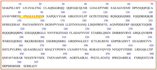 To screen the ACEI peptide, several in silico methods (Peptide Ranker and molecular docking) were used in the present study. Firstly, as the molecular weights of the identified protein ranged from 702.366–2590.46 Da with the number of amino acids from 7–23 and the study paid more attention to the peptides with a lower molecular weight, the identified peptides with amino acids no more than 10 were selected for further study. Secondly, Peptide Ranker was adopted to analyze the possibility of the peptide to be bioactive. As listed in Table 2, the peptide EPNGLLLPQY acquired the highest scores of Peptide Ranker, so it has the highest likelihood to inhibit ACE activity. Thirdly, molecular docking was employed to verify the affinity of the peptides binding to ACE. It is not hard to see that the peptide EPNGLLLPQY also has a relatively high affinity with ACE, which was evaluated by comparing the scores of “-CDOCKER_Interaction_Energy”, an evaluation function of the affinity of the donor and ligand in molecular docking in Discovery Studio 2017. Therefore, the peptide EPNGLLLPQY was chose for further ACEI analysis. The molecular mass of the peptide was 1142.60 Da, which was determined by MS/MS. Moreover, the location of EPNGLLLPQY (marked in red letter) in walnut seed storage proteins (Q2TPW5) from the PDB database is shown in Figure 2.