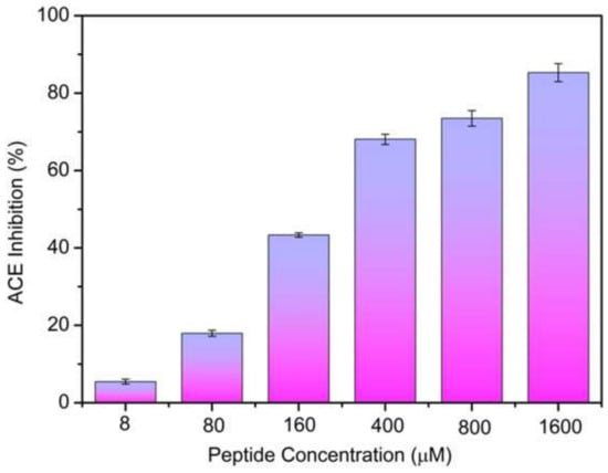 In the present study, the ACE-inhibitory activity of the peptide, EPNGLLLPQY, released by pepsin digestion was evaluated, as shown in Figure 3. The ACE-inhibitory activity of the peptide at different concentrations (8–1600 µM) was determined, the inhibitory activity increased with the increase of the concentration in a dose-dependent pattern. The IC50 value was determined by the regression equation: Y = −(1.93948 × 10−4)X2 + 0.24469X + 3.48868 (R2 = 0.97179). The IC50 value of the peptide was 233.178 µM. There have been about 700 kinds of ACE-inhibitory peptides from many kinds of proteins reported till now, all of which were collected in the BIOPEP database http://www.uwm.edu.pl/biochemia/index.php/en/biopep [25], and the IC50 values of the peptides ranged from 0.01–10,000 µM. The peptide EPNGLLLPQY can be considered as a potential ACE inhibitor due to its high activity.