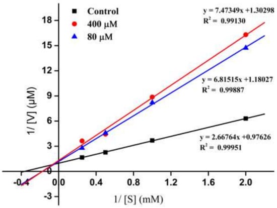 To further evaluate the active mechanism of the novel ACEI peptide, the inhibition pattern of the peptide, EPNGLLLPQY, against ACE was investigated by the Line weaver-Burk plot analysis method. As shown in Figure 4, three experimental groups (■ control; ▲ 80 μM; ● 400 μM) were tested, and 1/(S) and 1/(V) represent the reciprocal substrate concentration and velocity, respectively. The Vm values decreased as the peptide concentration increased, which confirmed that the existence of the peptide probably blocked the substrate from binding to ACE active sites. When the EPNGLLLPQY was added to the reaction system, the Km values become higher than the control, which indicated that a relative higher content of substrate was essential for the ACE catalytic reaction. Figure 4 presents an ACEI peptide exhibiting a mixed-type of inhibition of ACE. Similar food-derived peptides EVSQGRP, VSRHFASYAN and SAAVGSP also have been identified from Stichopus horrens [26]. The mixed-type inhibition indicated that the peptide binds to the ACE at positions including both the active and non-active sites, which consequently reduces the catalytic activity of ACE. Since ACE converts the hormone angiotensin I to the active vasoconstrictor angiotensin II, binding on the active site will directly prevent the cleavage ability of ACE. Binding on the non-active sites probably prevents the interaction of the ACE and the substrate by the steric hindrance effect.