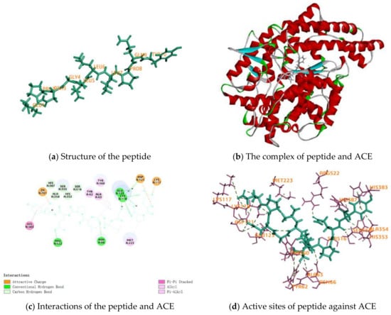 The relationship between the amino acid sequence and the bioactivity of peptides is a hot topic in this field, which is attracting more attention. In the previous studies, several ACE-inhibitory peptides from walnut proteins had been purified and identified [12,18,20]. Moreover, the molecular docking method can provide some simulation interaction information between the receptor and the biological macromolecular ligand based on the ligand and receptor lock and key principle [21], which can be used to analyze the interactions between the peptide and ACE [22].