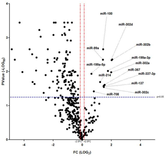 Hierarchical clustering analysis plot was computed in order to obtain a global view of microRNA expression levels and to identify clustered group of microRNAs. Differentially expressed microRNAs were identified by performing a Volcano-plot analysis by applying a cut-off fold change of >2.5 (upregulated) or <0.4 (downregulated) and a statistical cutoff of FDR corrected p-value of p < 0.05 using Student’s t-test on normalized ∆Ct values. Hierarchical clustering analysis plot and volcano plot were elaborated using Spotfire 5.0 (Tibco, Somerville, MA, USA) and GraphPad 5.0 (GraphPad Prism, La Jolla, CA, USA), respectively.