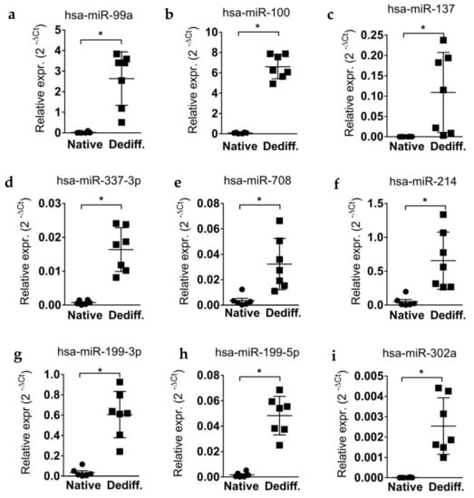 In order to confirm the upregulation of the 13 differentially expressed microRNAs in dedifferentiated islet cells, we validated their expression using single assay stem–loop RT-qPCR in the same samples previously profiled and in additional human pancreatic native islet preparations and dedifferentiated islet-derived cell samples (a total of n = 6 native human pancreatic islet samples; n = 7 dedifferentiated islet-derived cell samples) (donors characteristics reported in Supplementary Table S1). The analysis confirmed the results obtained in the profiling stage (Figure 2), thus revealing the significant upregulation (p < 0.05, non-parametric Mann–Whitney U test) of those microRNAs upon in vitro dedifferentiation of non-diabetic human pancreatic islet cells.