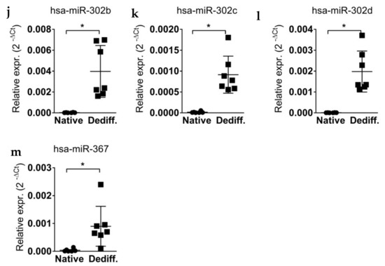 - Wilson, K.D.; Venkatasubrahmanyam, S.; Jia, F.; Sun, N.; Butte, A.J.; Wu, J.C. MicroRNA profiling of human-induced pluripotent stem cells. Stem Cells Dev. 2009, 18, 749–758. [Google Scholar] [CrossRef] [PubMed]