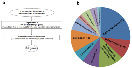 In order to identify the pattern of target genes regulated by the entire set of upregulated microRNAs in dedifferentiated islet-derived cells and potentially involved in this process, we adopted a bioinformatic approach using a microRNA-target gene prediction algorithm (Targetscan 6.2) followed by a gene ontology (GO) classification profiling (David 6.7) (bioinformatic workflow scheme in Figure 3a). Overall, for the 13 upregulated microRNAs, we identified 196 target genes involved in differentiation, cell-adhesion or proliferation functions. In order to obtain a more in depth functional classification, the set of identified predicted target genes were analyzed using David 6.7 (Figure 3a).