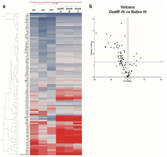 To determine whether the 92 selected target genes were differentially expressed during in vitro dedifferentiation, we evaluated their levels in human native islets (n = 3) and dedifferentiated islet cell samples (n = 3), initially analyzed for microRNA expression profiles. The results revealed that 48/92 genes were significantly differentially expressed. Among them, 44/92 genes were downregulated while 4/92 genes were upregulated in dedifferentiated islet cells vs. human native pancreatic islets (Figure 4a,b).