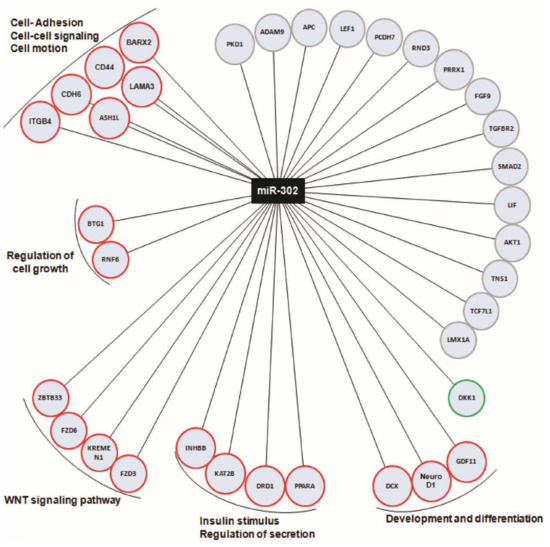 miR-302s target genes are involved in the loss of epithelial phenotype. miR-302 family are downregulated in islet-derived dedifferentiated cells respect to native human islets and are mainly involved in cell adhesion and motion, cell–cell signaling, cell growth, development and differentiation, WNT signaling pathway and insulin stimulus, as well as regulation of secretion. The scheme reports the entire set of analyzed miR-302s target genes; downregulated genes in islet-derived dedifferentiated cells are reported in red, while those upregulated are in green. Grey highlighted miR-302s target gene did not show any significant differential expression upon dedifferentiation.