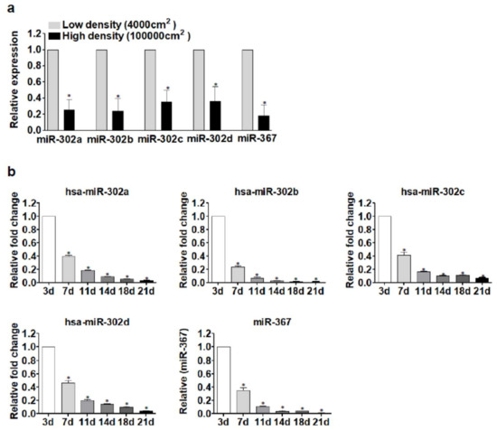 Cell–cell contacts contribute to the modulation of miR-302s expression. (a) miR-302 family members expression evaluation using stem–loop RT-Real Time PCR in dedifferentiated islet cells cultured at different density (4000 cells/cm2 vs. 100,000 cells/cm2) for 48 h. Values are reported as mean fold change ± SD vs. low density plated dedifferentiated islet cells. n = 3 independent experiments using three different human islets-derived dedifferentiated cells preparations, p-value Student’s t-test * p < 0.05. (b) Evaluation of miR-302s expression during re-differentiation of human islet-derived dedifferentiated cells, starting from day 3 and evaluated at day 7, 11, 14, 18, and 21. Values are reported as mean fold change ± SD vs. day 3 of re-differentiation. n = 3 independent experiments using three different human islets-derived dedifferentiated cells preparations, p-value Student’s t-test * p < 0.05.