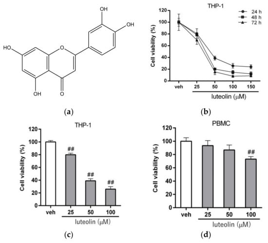 Effects of luteolin on the viability of human myeloid leukemia cells. (a) Chemical structure of luteolin. (b) THP-1 cells were treated with vehicle (0.1% dimethyl sulfoxide (DMSO)) or luteolin (25, 50, 100 and 150 μM) for 24 h, 48 h and 72 h, respectively. Cell viability was measured by MTT assay. The data are presented as the means ± standard deviation (SD) from three independent experiments. THP-1 cells (c) and peripheral blood mononuclear cells (PBMCs) (d) were treated with vehicle or luteolin (25, 50 and 100 μM) for 24 h, and cell viability was determined by MTT assay. The data are presented as the means ± SD from three independent experiments. ## p < 0.01 represents a significant difference compared to the vehicle-treated cells (veh).