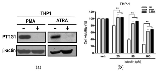 It is known that differentiating agents such as phorbol 12-myristate 13-acetate (PMA) and all-trans-retinoic acid (ATRA) drive myeloid leukemia cells, such as THP-1, HL-60 or K562 cells, toward differentiation and a normal cell-like phenotype. We previously demonstrated that PTTG1 is not expressed in normal PBMCs and that PTTG1 expression is significantly reduced in PMA-differentiated THP-1 cell lines []. To investigate the cytotoxic effect of luteolin in myeloid leukemia cells with differential PTTG1 expression, we first determined the PTTG1 protein level in PMA- and ATRA-differentiated THP-1 cells. The cells were pretreated with PMA (200 nM) or ATRA (10 uM) for 72 h to induce cell differentiation, and the PTTG1 protein level was measured by Western blot analysis. As shown in Figure 2a, the PTTG1 protein level was dramatically attenuated in PMA- and ATRA-differentiated THP-1 cells. We further examined the cytotoxic effect of luteolin in differentiated THP-1 cells. The differentiated cells were incubated with luteolin (25–100 μM) for 24 h, and the viability of undifferentiated THP-1 cells was more significantly decreased by luteolin than that of PMA- or ATRA-differentiated cells at the same concentration of luteolin treatment (p < 0.01) (Figure 2b). The PTTG1 protein level was also significantly reduced in PMA- or ATRA-induced differentiated HL-60 and K562 cells (Figure S2a,c). Cell viability was decreased in luteolin-treated undifferentiated HL-60 and K562 cells compared with the PMA- or ATRA-differentiated cells (Figure S2b,d). These data indicated that the undifferentiated leukemia cells with a high level of PTTG1 protein are more sensitive to luteolin-mediated cytotoxicity.