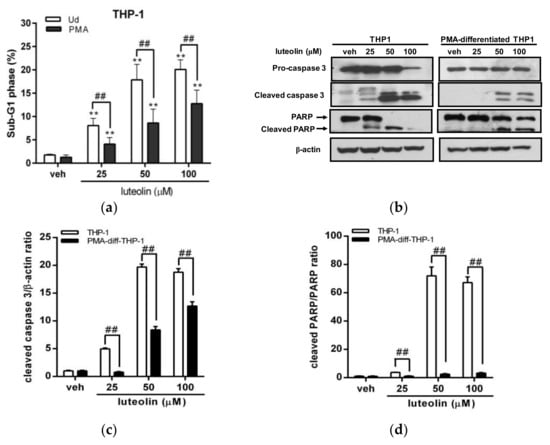 Effects of luteolin on the apoptosis of THP-1 cells with differential PTTG1 expression. (a) The undifferentiated or PMA-differentiated THP-1 cells were treated with vehicle or luteolin (25–100 μM) for 24 h, and then, the cell population in sub-G1 phase was determined by flow cytometric analysis. The experiments were triplicated, and the data are presented as the means ± SD from three independent experiments. ** p < 0.01 represents a significant difference compared to the vehicle group (veh). ## p < 0.01 represents a significant difference compared to the undifferentiated cells (Ud group). (b) Apoptotic marker proteins, including pro-caspase 3, cleaved caspase 3, PARP1 and cleaved PARP1, were analyzed by Western blot analysis. The experiments were triplicated, and a representative blot is shown. (c) The intensity of cleaved caspase 3 versus β-actin proteins is normalized and presented as the mean ± SD of triplicated experiments. (d) The intensity of cleaved PARP1 versus total PARP1 proteins is normalized and presented as the mean ± SD of triplicated experiments. ## p < 0.01 represents a significant difference compared to the undifferentiated THP-1 cells (THP-1 group).