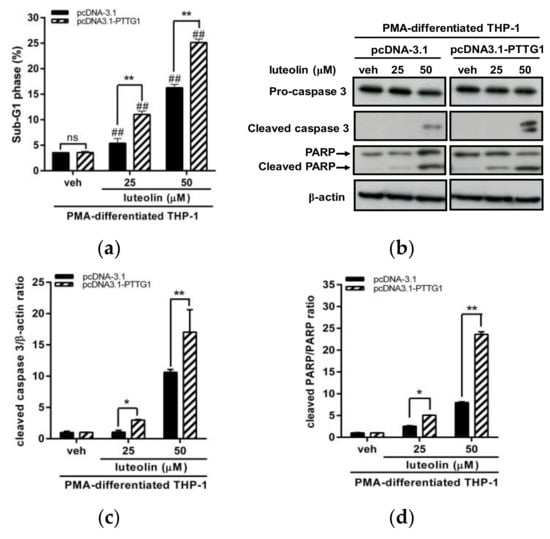 To investigate the effect of cell apoptosis induced by luteolin in cells with differential expression of PTTG1, we further analyzed the cell apoptotic effect of luteolin on undifferentiated or PMA-differentiated THP-1 cells using flow cytometric analysis. As shown in Figure 3a, the percentage of the cell population in sub-G1 phase (dead cell population) in luteolin-treated THP-1 cells (25, 50 and 100 μM) was significantly increased from 1.8% to 8.1%, 17.9% and 20.1%, respectively, compared with the vehicle group (p < 0.01). However, treatment of PMA-differentiated THP-1 cells with luteolin (25–100 μM) significantly attenuated the cell population in the sub-G1 phase to approximately 4.1%, 8.6% and 12.8%, respectively, compared to undifferentiated cell groups (1.3%) (p < 0.01). We further analyzed apoptosis-related markers, including cleaved caspase 3 and poly (ADP-ribose) polymerase 1 (PARP1), using Western blot analysis. As shown in Figure 3b–d, we found that treatment of undifferentiated THP-1 cells with luteolin markedly increased the levels of apoptotic protein markers, including cleaved caspase 3 and PARP1 proteins. In contrast, the cleaved forms of caspase 3 and PARP1 proteins were not or were slightly detected in PMA-differentiated THP-1 cells under the same conditions. These results indicated that luteolin induced less severe apoptosis in human myeloid leukemia cells that are differentiated by PMA, which have less PTTG1 protein.