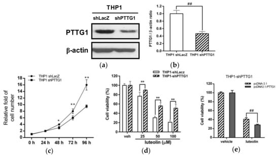 The above findings suggested that higher expression of PTTG1 in undifferentiated leukemia cells were associated with a higher apoptotic response to luteolin administration. To elucidate this hypothesis, we generated PTTG1-knockdown cells by shRNA in leukemia cell lines. We successfully generated a PTTG1-knockdown THP-1 cell clone (THP1 shPTTG1), and the PTTG1 protein level was dramatically reduced by approximately 54% compared with that in shLacZ control cells (Figure 5a,b). As shown in Figure 5c, cell proliferation was significantly inhibited in PTTG1-knockdown cells compared to THP1 shLacZ control cells. Furthermore, we investigated the effect of luteolin on the viability of PTTG1-knockdown cells. As shown in Figure 5d, the viability of PTTG1 knockdown cells treated with luteolin (25–100 μM) was higher than that of luteolin-treated cells in the shLacZ control group (p < 0.01). These effects of PTTG1-knockdown on cell proliferation and luteolin response were confirmed in another PTTG1-knockdown cell clone (THP1 shPTTG1#16) (Figure S4). A similar effect on cell viability was also found in luteolin-treated HL-60- or K562-shPTTG1 cells (Figure S5). Moreover, to investigate whether rescue of PTTG1 protein expression altered the luteolin-induced cell death in the PTTG1-knockdown cells, the THP1 shPTTG1 cells were transfected with pcDNA3.1-PTTG1 expression plasmid followed by treatment of luteolin (100 μM) and cell viability was measured using MTT assay. As shown in Figure 5e, the rescue of the PTTG1 expression significantly reduced the cell viability of luteolin-treated cells. These data verified that PTTG1 knockdown in leukemia cells caused the attenuation of cell proliferation and resistance to luteolin-mediated cell death.