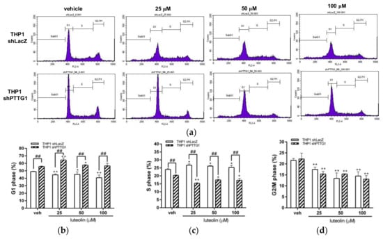 To further elucidate the effects of luteolin on the cell cycle and apoptosis in PTTG1-knockdown cells, THP1 shLacZ and THP1 shPTTG1 cells were treated with luteolin (25–100 μM) for 24 h, followed by flow cytometric analysis. The results of the cell-cycle analysis are shown in Figure 6a. In luteolin-treated THP1 shLacZ cells, the cell population in the S phase was increased (Figure 6c); however, the cell populations in the G1 and G2/M phases were decreased (Figure 6b,d). These data indicated that luteolin induced S phase arrest in THP-1 leukemia cells. In PTTG1-knockdown cells, cells treated with or without luteolin presented significantly increased cell populations in the G1 phase (Figure 6c). The cell populations in the S and G2/M phases were decreased in luteolin-treated cells (Figure 6b,d). These data suggested that PTTG1 knockdown in THP-1 cells leads to cell-cycle arrest in the G1 phase and modulates the effect of luteolin on cell-cycle progression.