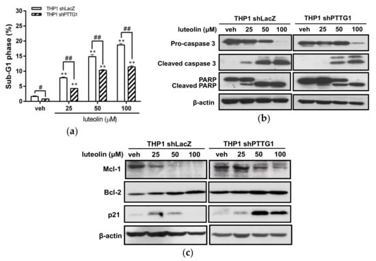 Effects of luteolin on the apoptosis of PTTG1-knockdown THP-1 cells. The THP1 shLacZ and shPTTG1 cells were treated with vehicle or luteolin (25–100 μM) for 24 h. (a) Cell population in the sub-G1 phase was determined by flow cytometric analysis. The experiments were triplicated, and the data are presented as the means ± SD from three independent experiments. ** p < 0.01 represents a significant difference compared to the vehicle group (veh). # p < 0.05 and ## p < 0.01 represent a significant difference compared to the THP1 shLacZ control cells. (b) The protein expression levels of pro-caspase 3, cleaved caspase 3, PARP1, cleaved PARP1 and β-actin proteins were analyzed by Western blot analysis. The experiments were triplicated, and a representative blot is shown. (c) The Mcl-1, Bcl-2, p21 and β-actin proteins were analyzed by Western blot analysis. The experiments were triplicated, and a representative blot is shown.