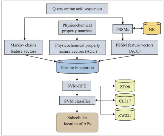 To date, computational methods have been reported to efficiently identify the subcellular location of APs [7]. These methods were developed based on; (1) the design of the protein encoding scheme of the feature extraction; (2) the selection of the classifier [7]. Some sequence features are used for the first task, e.g., amino acid composition [8], dipeptide composition, which represents the composition of amino acid pairs and gapped amino acid pairs [9], pseudo amino acid composition [10,11,12,13,14], Markov chains [15], wavelet coefficients [3], distance frequency [16], grouped weight encoding [2], PSSMs [7,17,18], and gene ontology [19,20]. For example, the Markov chains, being a discrete stochastic model [21], contain the frequencies of 20 native amino acids and the information of amino acid pairs in protein sequences, which reflect the composition and local amino acid order of the protein sequences. They have been used for the identification of interaction sites between proteins and nucleic acids [21,22]. The PSSM reflects the evolutionary information of a protein sequence, and has been used for the prediction of protein function [23], subcellular location [5], and structural class [24,25]. In addition, a few machine learning algorithms have been developed for the second task, including the fuzzy k-nearest neighbor algorithm [12], SVM [3,7,16,17,18], covariant discrimination algorithm [9], and ensemble classifier [26,27]. Among these, the SVM proposed by Vapnik [28] exhibited the most promising results [7]. It is a supervised machine learning algorithm based on the structural risk minimization principle of statistical learning theory [26]. Samples labeled positive or negative are projected into a high dimensional feature space using a kernel, in which the hyper plane is optimized to maximize the margin of positive and negative samples [29]. For the SVM-based methods, it is crucial to convert the protein sequences with different lengths into fixed-length vectors [18]. The ACC transformation method was developed by Wold et al. [30], and has been widely used in protein family classification and protein interaction prediction [31,32]. Although computational methods, such as PSSM-trigram [7] and FKNN (fast k-nearest neighbor algorithm) [12], have been reported to reliably identify the subcellular location of APs, there is still room for improvement of the prediction accuracy. In our previous research, we established highly accurate protein structural class prediction methods based on the PSSMs using the SVM classifier [25,32]. In this study, we developed a novel method named iAPSL-IF using integrative features captured from amino acid sequences (Figure 1), and examined it based on three datasets ZD98, CL317, and ZW225 using the jackknife cross-validation test, as it is an objective and rigorous statistical test [22]. In jackknifing, a part of the sample is systematically omitted, for example, by removing one data point at a time, and the analysis is then carried out for each newly constructed subset [33]. Our data indicated that the iAPSL-IF achieved better results than the known predictors reported in the literature.