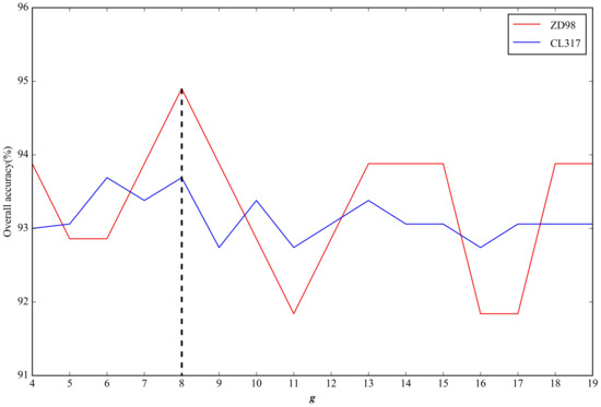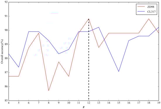 The effects of g on overall accuracy based on the datasets ZD98 and CL317 after ACC transformation of the physicochemical property matrices.