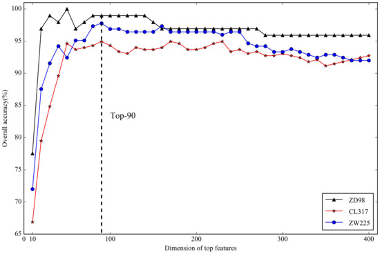 Although the integrated features captured sequence information from multiple aspects, the number of candidate features was large and the original feature space may have contained noisy and redundant features. Therefore, we reduced the dimensions using the SVM-RFE method [35], and improved the performance: (1) less prone to overfitting; (2) able to make full use of the training data; (3) much faster [29]. The feature vectors of a dataset were ranked according to their importance, and their top-K (K = 10, 20, 30, …, 380, 390, 400) [32] features were examined by the jackknife cross-validation test. The resulting data were illustrated in Figure 4. Based on the dataset ZD98, when K = 50, the highest overall accuracy (OA) was observed (100%), whereas when K = 90, the highest OA was 94.95% and 97.78% on the datasets CL317 and ZW225, respectively. In order to avoid losing important information if the dimension was low, we choose the top-90 ranked features for further analyses.