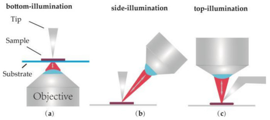 According to the lighting direction, the optical geometries of TERS equipment can be divided into three types: bottom illumination, top illumination and side illumination, as shown in Figure 1. Figure 1a sketches the bottom illumination which is composed of an inverted objective and a scanning system. This type is also called transmission mode. In this mode, the end of the TERS probe can be illuminated and enhanced efficiently by an inverted oil immersion objective (N.A. = 1.4) [28,29,30]. Such a TERS system was employed by Hayazawa et al. In the related experiments, an AFM-TERS system with a silver-coated tip and an inverted oil immersion objective was used to collect TERS information of the samples [31,32,33]. It is obvious that an opaque sample is unsuitable since the laser beam cannot pass through the sample and illuminate the end of the tip. Therefore, this kind of TERS system was used during the early development stages of TERS.