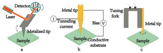 According to the feedback mechanisms which keep the tip close to the sample surface, TERS systems are generally divided into three types: AFM-TERS, STM-TERS and shear force microscopy based TERS (SFM-TERS). They are schemed in Figure 2a–c, respectively.