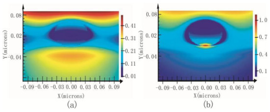 If a metallized probe is brought very close to a substrate with gold layer, there will arise a stronger enhancement signal owning to the sandwich-type assay called “gap mode”. The signal strength is mainly attributed to the particle dimension, the gap dimension and the polarization of the irradiating field [80]. A few experiments were carried out to investigate C60 molecules in different diluted solutions at the nanomolar scale. The results indicated that the gap mode spectrum had higher signal intensity than SERS spectrum [81]. This conclusion is the same with the calculation results of Finite-Difference Time-Domain (FDTD), which is a numerical analysis technique used for modeling computational electrodynamics. Since it is a time-domain method, FDTD solution can cover a wide frequency range with a single simulation run, and treat nonlinear material properties in a natural way. Figure 3 shows the FDTD results of the electromagnetic field between 70 nm gold nanoparticles and different substrates. Distance between the particle and corresponding substrate is adjusted to 1 nm. The substrate in Figure 3a is silicon and that in Figure 3b is gold. The enhanced area in Figure 3a is about 70 nm (similar to the diameter of the particle) and the enhanced area in Figure 3b is about 10 nm with a stronger electromagnetic field (typical gap mode). This proves that gap mode can make signal intensities and resolution improved at the same time for it can confine stronger light within a region that is much smaller than the diameter of the tip.