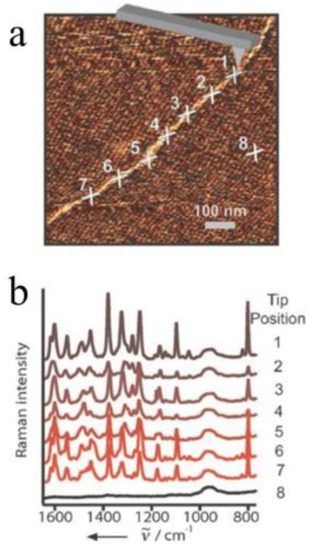 TERS experiment along an RNA strand. (a) Topography image (same as in Figure 2a) showing seven adjacent spots corresponding to the positions of the TERS experiments and one additional spot for the reference measurement (position 8); (b) The Ramans pectra of positions in (a). Reprinted with permission from ref. [44]. Copyright 2008, Wiley-VCH Verlag GmbH & Co. KGaA, Weinheim, Germany.