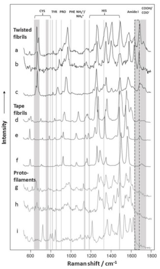 Selected TERS spectra acquired from the surfaces of insulin fibril polymorphs and their protofilaments. TERS spectra collected from the surfaces of twisted are shown in a–c and d–f are the Raman signals of flat fibrils, g–i are the TERS spectra collected from the surfaces of their protofilaments. Specific amino acid vibrational modes are marked with gray lines. Amide I bands are marked with dashed lines, showing the borders between protein secondary structures. NH2/NH3 (1144 cm−1) and COOH/COO—(1687–1700 cm−1) vibrational modes are also indicated. Reprinted with permission from ref. [25]. Copyright 2014, the Biophysical Society.
