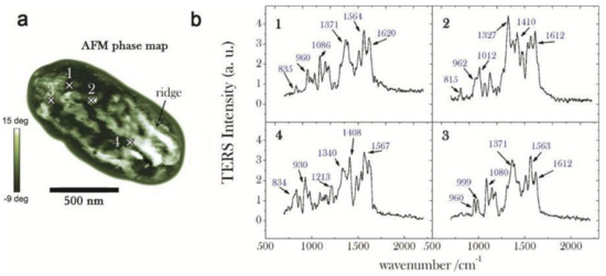 In recent years, Bacillus subtilis spores were also investigated by combining TERS with principal components analysis (PCA) [99]. In this work, the TERS mapping of the spore was analyzed, which provided some important information about the component distribution of the spore ridges (see Figure 6). These results showed the first and crucial step toward the correlative surface-chemistry characterization of spores via nanoscale spectroscopy. The authors further demonstrated that TERS mapping can be connected to AFM-phase images by the combination of PCA and TERS, which could allow one to visually discriminate the relevant chemical distribution of complex biological systems.