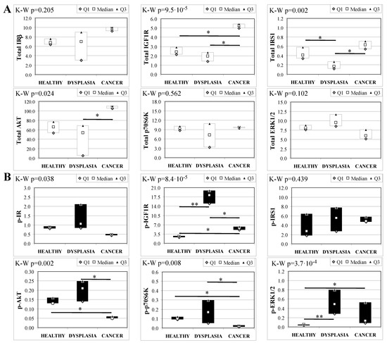 Insulin signaling in operated WT male mice esophageal tissue. Data are represented as Median (Q1; Q3). Data obtained in operated mice affected by dysplasia or cancer were compared to strain-, sex-, and age-matched, non-operated animals (43 weeks). K-W indicates the Kruskal-Wallis test result, used for multiple comparisons among the three groups of mice. The Mann-Whitney U-test was performed to compare data distribution between two groups of mice. A p-value lower than 0.016 (Bonferroni adjustment) was considered statistically significant: * p < 0.016; ** p < 1.6 × 10−3. (A) Total protein expression: the quantity of each total protein considered was expressed in ng/100 mg of total protein extracted by the distal mice esophageal segment. (B) Phosphorylated protein expression: the amount of the six phospho-proteins considered was expressed as phosphorylated Units for each ng of the corresponding total protein amount. Proteins were quantified by Luminex-xMAP Technology on the basis of a standard curve. Beta-tubulin expression was used as the internal loading control.