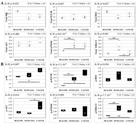 Insulin signaling in operated MKR female mice esophageal tissue. Data are represented as Median (Q1; Q3). Data obtained in operated mice affected by dysplasia or cancer were compared to strain-, sex-, and age-matched, non-operated animals (43 weeks). K-W indicates the Kruskal-Wallis test result, used for multiple comparisons among the three groups of mice. Mann-Whitney U-test was performed to compare data distribution between two groups of mice. A p-value lower than 0.016 (Bonferroni adjustment) was considered statistically significant: * p < 0.016; ** p < 1.6 × 10−3. (A) Total protein expression: the quantity of each total protein considered was expressed in ng/100 mg of total protein extracted by the distal mice esophageal segment. (B) Phosphorylated protein expression: the amount of the six phospho-proteins considered was expressed as phosphorylated Units for each ng of the corresponding total protein amount. Proteins were quantified by Luminex-xMAP Technology on the basis of a standard curve. Beta-tubulin expression was used as the internal loading control.