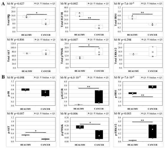 Insulin signaling in operated MKR male mice esophageal tissue. Data are represented as Median (Q1; Q3). Data obtained in operated mice affected by cancer were compared to strain-, sex-, and age-matched, non-operated animals (43 weeks). The Mann-Whitney U-test was performed to compare data distribution between the two groups of mice. A p-value lower than 0.05 was considered statistically significant: * p < 0.05; ** p < 0.005. (A) Total protein expression: the quantity of each total protein considered was expressed in ng/100 mg of total protein extracted by the distal mice esophageal segment. (B) Phosphorylated protein expression: the amount of the six phospho-proteins considered was expressed as phosphorylated Units for each ng of the corresponding total protein amount. Proteins were quantified by Luminex-xMAP Technology on the basis of a standard curve. Beta-tubulin expression was used as the internal loading control.