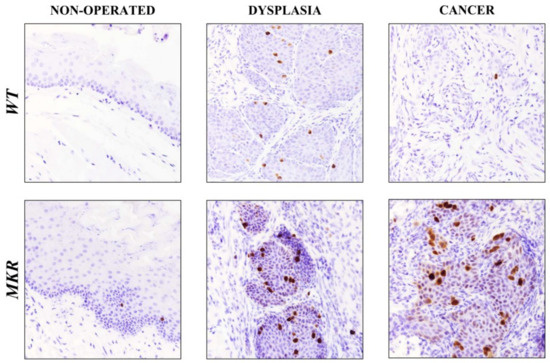 Representative case of Ki-67 nuclear protein expression on healthy, dysplastic and neoplastic esophageal tissues in WT and MKR mice. Non-operated mice (healthy tissue): WT male and MKR male at 43 weeks of age. Dysplasia: squamous high-grade dysplastic lesions (HGD) in WT female and MKR female. Cancer: Moderately well differentiated ESCC in WT male and MKR male. Original magnification 40×.