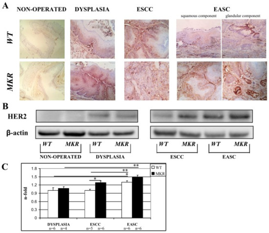 Representative case of HER2 overexpression detected by Immunohistochemistry IHC (A) and Western blotting (B). (A) WT (wild-type mouse esophageal tissue). From left to right: 1. Non-operated (healthy tissue) WT female at 43 weeks of age (IHC negative; original magnification 100×). 2. Squamous Dysplasia (LGD/HGD) in WT male (IHC2+; original magnification 200×). 3. ESCC in WT male (IHC3+ on both dysplastic and infiltrative component; original magnification 200×). 4. EASC in WT male (IHC2+ in squamous component and IHC1+ in glandular component; original magnification 200×). MKR (MKR mouse esophageal tissue). From left to right: 1. Non-operated (healthy tissue) MKR female at 43 weeks of age (IHC negative; original magnification 100×). 2. Squamous Dysplasia (HGD) in MKR female (IHC3+; original magnification 200×). 3. ESCC in MKR female (IHC2+; original magnification 200×). 4. EASC in MKR male (IHC3+ in both squamous and glandular component; original magnification 200×). (B) Thirty micrograms of extracted total proteins were separated in SDS-PAGE and transferred to nitrocellulose membranes. Membranes were blotted with anti-HER2 (molecular weight = 185 KDa) and anti-β-actin (molecular weight = 42 KDa) antibodies. Non-operated (healthy tissue) WT and MKR male at 43 weeks of age. Dysplasia: squamous HGD dysplasia in WT and MKR female. ESCC in WT and MKR female. EASC in WT and MKR male. (C) The densitometric intensity of bands is shown in the bar graphs. Data are presented as the mean ± SEM and the relative protein expression is indicated as n-fold of protein amount detected on WT dysplastic tissue which was set equal to 1 arbitrary unit. * p < 0.05; ** p < 0.01.