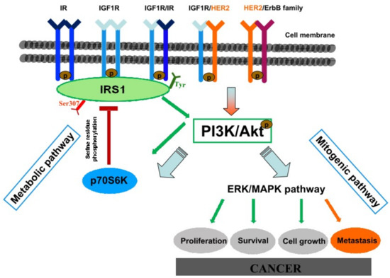 Hypothesized hyperinsulinemia-induced cancerogenetic mechanisms. Insulin and insulin-like growth factor 1 are closely related hormones that control different aspects of growth and metabolism in many organisms. At physiological levels, insulin and IGF-1 fully activate their cognate receptors and IGF-1 can also activate IR/IGF1R hybrid receptors. At supraphysiological levels they can also bind and activate each other’s’ receptor in cell culture models, although with reduced affinity. Activated IR/IGF1R receptors phosphorylate target proteins such as Insulin Receptor Substrate (IRSs) proteins on selective tyrosine residues (Tyr) that serve as docking sites for downstream effector molecules. Phosphorylated IRS1 activates the metabolic PI3K/Akt pathway. Activated Akt regulates glucose metabolism and induces the mitogenic (ERK/MAPK) pathway involved in carcinogenic mechanism. Serine (Ser)/Threonine phosphorylation of the IRS proteins is a key negative-feedback control mechanism that uncouples the IRS proteins from their upstream and downstream effectors and terminates signal transduction in response to insulin, under physiological conditions. Analogous mechanisms are involved in the molecular pathophysiology of insulin resistance by activating serine/threonine IRS kinases (such as the p70S6K) that phosphorylate the IRS proteins and inhibit their function. Hyperinsulinemia is responsible of receptors hyperactivation inducing IR, IGF1R, and ERK over-expression. HER2 signal activation is known to have a pivotal role in esophageal cancerogenesis and disease progression. Hyperinsulinemia is able to induce also HER2 overexpression. HER2 is the preferential dimerization partner of other members of the ErbB family and other growth factor receptors. A cross-talk between HER2 and IGF1R signaling pathway has been proven in breast cancer through an heterodimerization mechanism. An analogous mechanism is proposed also in this context, in which hyperinsulinemia-induced IGF1R overexpression might enhance the possibility to form HER2/IGF1R heterodimers, promoting mitogenic pathway activation and, in turn, cancer.