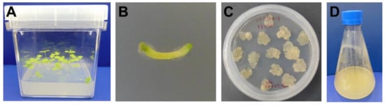 Callus generation. (A) Aseptically grown ΔXTFT N. benthamiana plants; (B) Explant from ΔXTFT N. benthamiana plant on semi-solid media; (C) ΔXTFT N. benthamiana callus formed from dedifferentiation of explants and grown on semi-solid media; (D) ΔXTFT N. benthamiana cells in suspension culture.