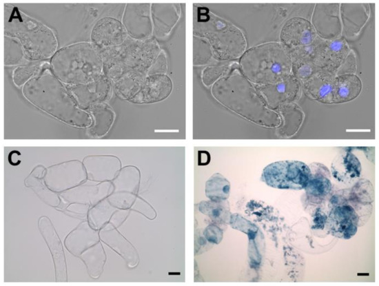 Morphology of ΔXTFT N. benthamiana cell suspension culture. Scale bars indicate 20 µm. (A,B) Same field of view; (B) Nuclear staining with DAPI; (C) Cells stained with Evans blue; (D) Cells treated with 70% ethanol for 3 h prior to Evans blue staining.