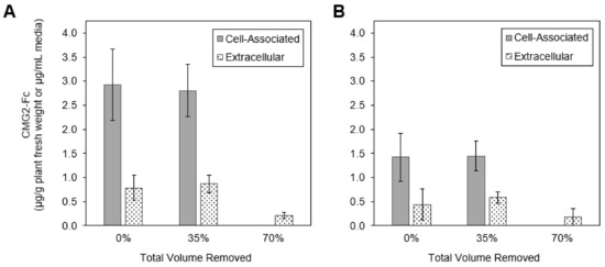 The total co-culture volume was varied to assess the impact of simultaneously increasing the concentrations of Agrobacterium and plant cells (Figure 6). To reduce the total volume while maintaining the same total biomass, the plant cell culture (48 mL) was centrifuged and a portion of the supernatant was removed. The same volume of Agrobacterium (1.1 mL) was added to each flask after media removal. Removing 35% of the culture volume did not affect CMG2-Fc expression levels. However, when 70% of the culture volume was removed, cell-associated CMG2-Fc was not detected and extracellular CMG2-Fc decreased. The same responses were observed for the two mass ratio levels of Agrobacterium to plant cells that were tested. In this experiment, higher expression was observed at an average mass ratio of 11.5 mg dry weight Agrobacterium/g dry weight plant cell than at 23.2 mg/g. Prior to media removal, the average plant cell dry weight of the flasks was 2.7 g/L with a standard deviation of 0.4 g/L. Again, extracellular CMG2-Fc was detected although a SEKDEL sequence was included on the CMG2-Fc protein.
