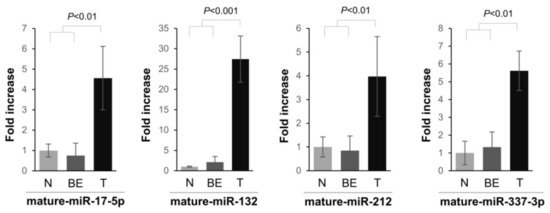 Expression levels of mature miRNAs, miR-17-5p, miR-132-3p, miR-212-3p, and miR-337-3p in normal (N), benign (BE), and malignant (T) human pancreatic tissues. The expression of miRNAs was quantified using the TaqMan MicroRNA Assay. miRNA expression was related to the 18S ribosomal RNA internal control, and data were calculated using the comparative CT method. The relative fold increase of miRNAs with respect to normal tissues are presented.