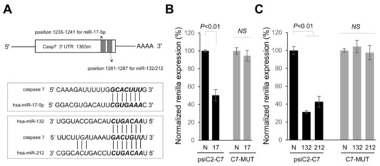 Caspase-7 (casp-7) is downregulated in miR-17-5p and miR-132-3p/-212-3p overexpressing cells. (A) Real time qPCR analyses of casp-7 mRNA levels in PANC-1 cells transfected with pre-miR-negative control (N), pre-miR-17-5p, or a mixture of pre-miR-132-3p and -212-3p (25 nM + 25 nM) at 50 nM for 48 h. The data are the mean ± s.d. for three independent experiments. * p < 0.01. (B) Treatment conditions were the same as in (A) and the expression levels of either miR-17-5p, miR-132-3p, or miR-212-3p in PANC-1 cells were determined by real time qPCR. ** p < 0.001. (C) PANC-1 cells were transfected with pre-miR-negative control (N), pre-miR-17-5p, or a mixture of pre-miR-132-3p and -212-3p (25 nM + 25 nM) at 50 nM for 48 h, and then protein lysates were isolated and subjected to Western blot analysis of pro-casp-7. β-actin served as a loading control and relative expressions are indicated. Western blotting and qPCR were performed on separately treated samples of cells.