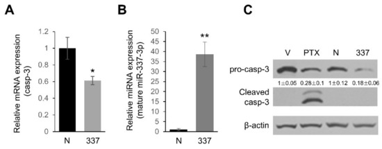 Caspase-3 (casp-3) is downregulated in miR-337-3p overexpressing cells. (A) The level of casp-3 mRNA was determined by real time qPCR and normalized with the 18S RNA level in PANC-1 cells after transfection of pre-miR-negative control (N) or pre-miR-337-3p (337). * p < 0.01. (B) Treatment conditions were the same as in (A) and the expression level of mature miR-337-3p in PANC-1 cells was determined by real time qPCR. ** p < 0.001. (C) Either pre-miR-nega control (N) or pre-miR-337-3p (337) was transfected into PANC-1 cells at 50 nM for 48 h, and then protein lysates were subjected to Western blot analysis of pro-casp-3 and cleaved casp-3. Paclitaxel (PTX) treated (1000 nM for 48 h) PANC-1 cells were used as a positive control of cleaved casp-3 expression. β-actin served as a loading control and relative expression are indicated. V indicates vehicle (DMSO) treated cells. Western blotting and qPCR were performed on separately treated samples of cells.