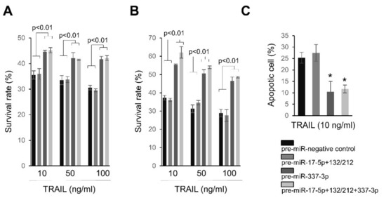 Based on our findings, we further examined the effects of miRNA targeting caspase-3 and -7 on the antiproliferative effects of TRAIL. PANC-1 cells over-expressing miR-337-3p became resistant to various concentrations of TRAIL, as compared to negative controls or pre-miR-17-5p+miR-132-3p/-212-3p transfected cells (Figure 6A,B). However, under our experimental conditions, there was no further contribution to TRAIL resistance when PANC-1 cells were co-transfected with miR-337-3p and miR-17-5p+miR-132-3p/-212-3p (Figure 6A,B). Following the treatment of TRAIL, the annexin-FITC assay showed decreased apoptotic events in PANC-1 cells over-expressing miR-337-3p, regardless of the over-expression of miR-17-5p+ miR-132-3p/-212-3p (Figure 6C).