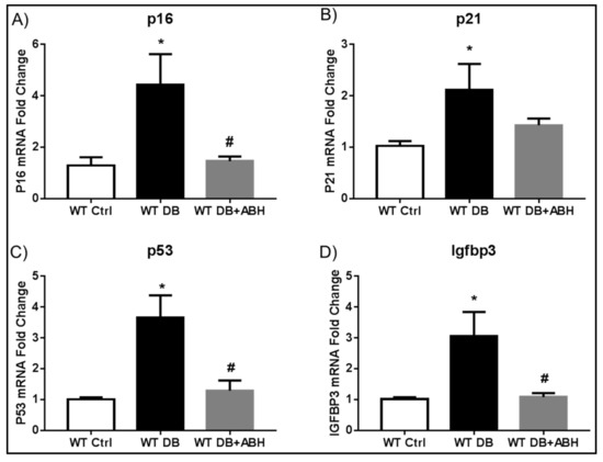 Arginase inhibition prevents diabetes-induced alterations in retinal senescence markers. qRT-PCR showing increased mRNA levels of p16 (A); p21 (B) p53 (C); and, Igfbp3 (D) in the diabetic retinas compared to age matched controls. 2(S)-Amino-6-boronohexanoic acid (ABH) treatment significantly blocked the diabetes-induced senescence. * p < 0.05 vs. WT Ctrl, # p < 0.05 vs. WT DB. n = 4–9.