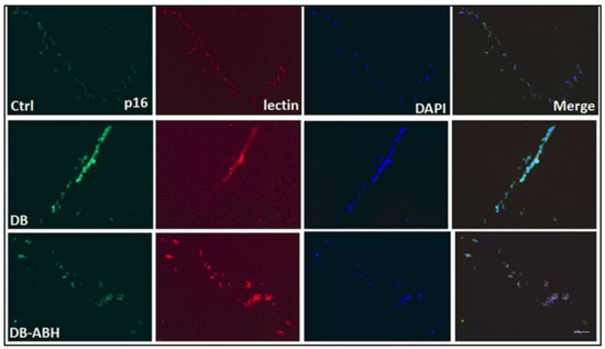 The isolated retinal vasculature was snap frozen in optimal cutting temperature (OCT) solution. Cryostat sections (10 μm) were obtained, mounted on glass slides and permeabilized with 1% Triton for 10 min and blocked in 10% normal goat serum for 1 h. Sections were then incubated with anti-p16INK4A antibody (Abcam, Cambridge, MA, USA; Cat. # ab189034; 1:50) and Alexa Fluor 594-conjugated isolectin GS-IB4 (Invitrogen, Carlsbad, CA, USA; Cat. # I21413; 1:200) at 4 °C overnight. On the next day, the sections were washed three times with phosphate-buffered saline (PBS) and were then incubated for 1 h at room temperature with Alexa Fluor 488-conjugated secondary antibody (Invitrogen, Carlsbad, CA, USA; Cat. # A11034; 1:400) that was washed in PBS, and covered with mounting medium containing 4′,6′-diamino-2-phenylindole (DAPI) for counterstaining (Vectashield; Vector Laboratories, Burlingame, CA, USA; Cat. # H-1200). Images from three to four samples per group were taken using Zeiss Axioplan2 Imager Microscope (Zeiss, San Diego, CA, USA). The results were analyzed by measuring the fluorescence intensity of p16 immunolabeling using ImageJ software.