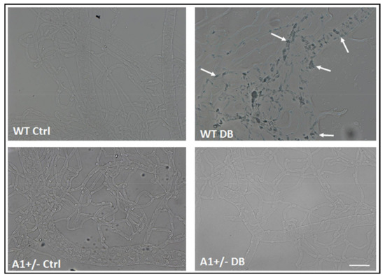 A1 deletion prevents diabetes-induced senescence in retinal vessels. SA β-Gal activity images of isolated retinal vessels showing increased activity (arrows) in vessels isolated from WT diabetic mice. The vessels isolated from A1+/− diabetic retinas are negative for SA β-Gal staining. The non-diabetic control retinas from both WT and A1+/− mice are also negative for SA β-Gal staining. n = 3–5. Scale bar = 50 µM.