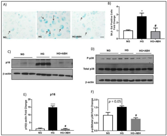 We and others have shown that high glucose induces premature EC senescence [2,17,18]. High glucose treatment also increases expression of arginase 1 in retinal vascular ECs [2,4]. To assess the role of arginase in diabetes/hyperglycemia-induced senescence of retinal microvascular ECs, we determined the effect of high glucose (HG) treatment on senescence of retinal ECs in relation to arginase 1 expression. Treatment of retinal ECs with HG induced upregulation of arginase 1 expression (Supplementary Figure S2) and this was associated with a significant increase in cellular senescence, as demonstrated by increased SA β-Gal activity (Figure 7A,B). Arginase inhibition with ABH prevented this increase and the number of senescent cells was reduced to a level that was comparable to normal glucose NG control conditions. Moreover, the senescence mediator, p16INK4A, was significantly increased with HG treatment and this was significantly abrogated with arginase inhibition (Figure 7C,E). High glucose treatment also increased the phosphorylation of the stress marker p38 MAPK, which was also reduced with ABH treatment (Figure 7D,F).