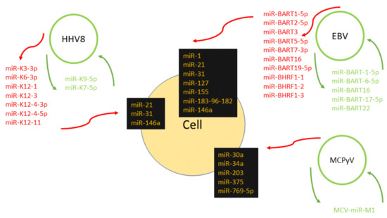 Viral miRNAs of Epstein–Barr virus (EBV), human herpesvirus 8 (HHV8) and Merkel cell polyomavirus (MCPyV), and cell miRNAs whose expression is influenced by the viral infection. The deregulation of these miRNAs contributes to the transformation of the cell and to tumor development. Green = viral miRNAs that target viral mRNAs, red = viral miRNAs that target cellular mRNAs, and yellow = cellular miRNAs influenced by the viral infection.