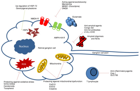 A diagrammatic summary of possible neurodegenerative mechanisms and their targeting (represented by line indicators, green: excitatory, red: inhibitory) in glaucomatous damage (Cop-1: Copolymer-1; CoQ10: Coenzyme Q10; DNQX: 6,7-Dinitroquinoxaline-2,3-dione; EGCG: Epigallocatechin galleate; Z-VLL-CHO: N-benzyloxycarbonyl-Val-Leu-leucine).